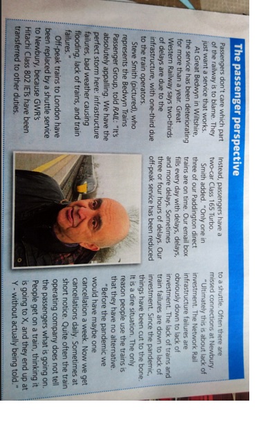 Other than Friday, the 1906 from Paddington did not run beyond Newbury last week. We didn’t find out until Wednesday when a passenger emailed us. We contacted GWR straightaway and they apologised for not informing us. It was taken off due to engineering works. Had we known we would have asked for a bus replacement to serve Kintbury, Hungerford and Bedwyn. Bill and I are both retired commuters so we are dependent on information from GWR or passengers. So, if you see something in the timetabling that looks a bit odd then please do let us know.
